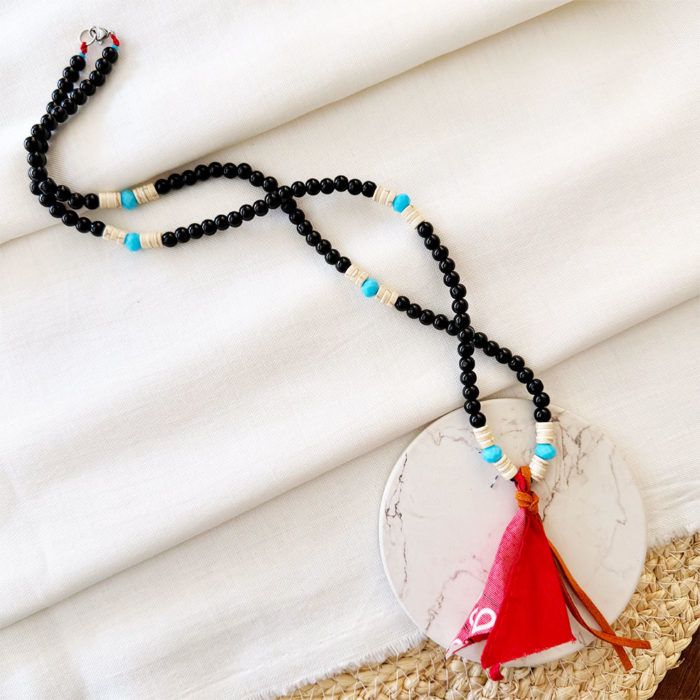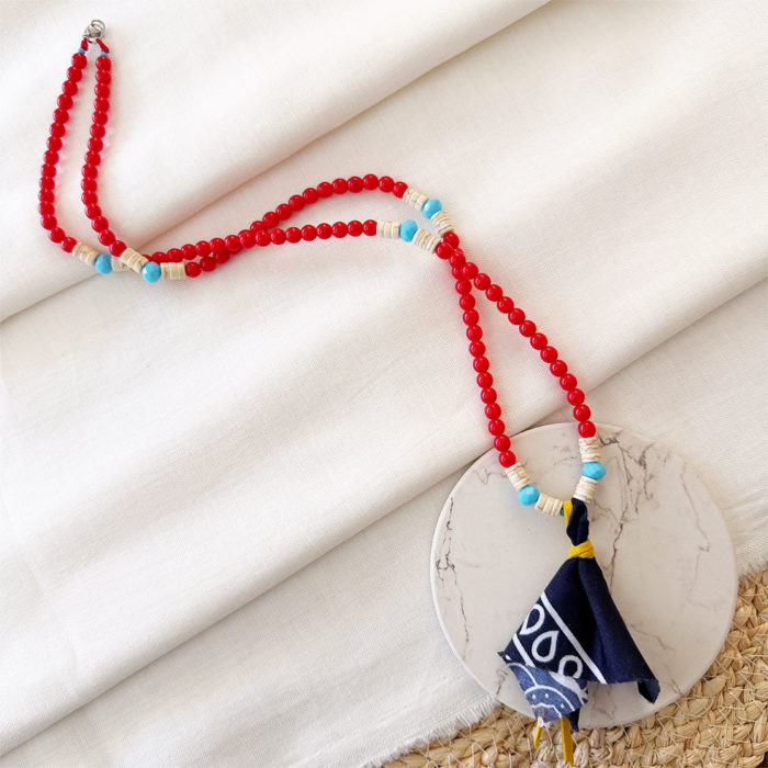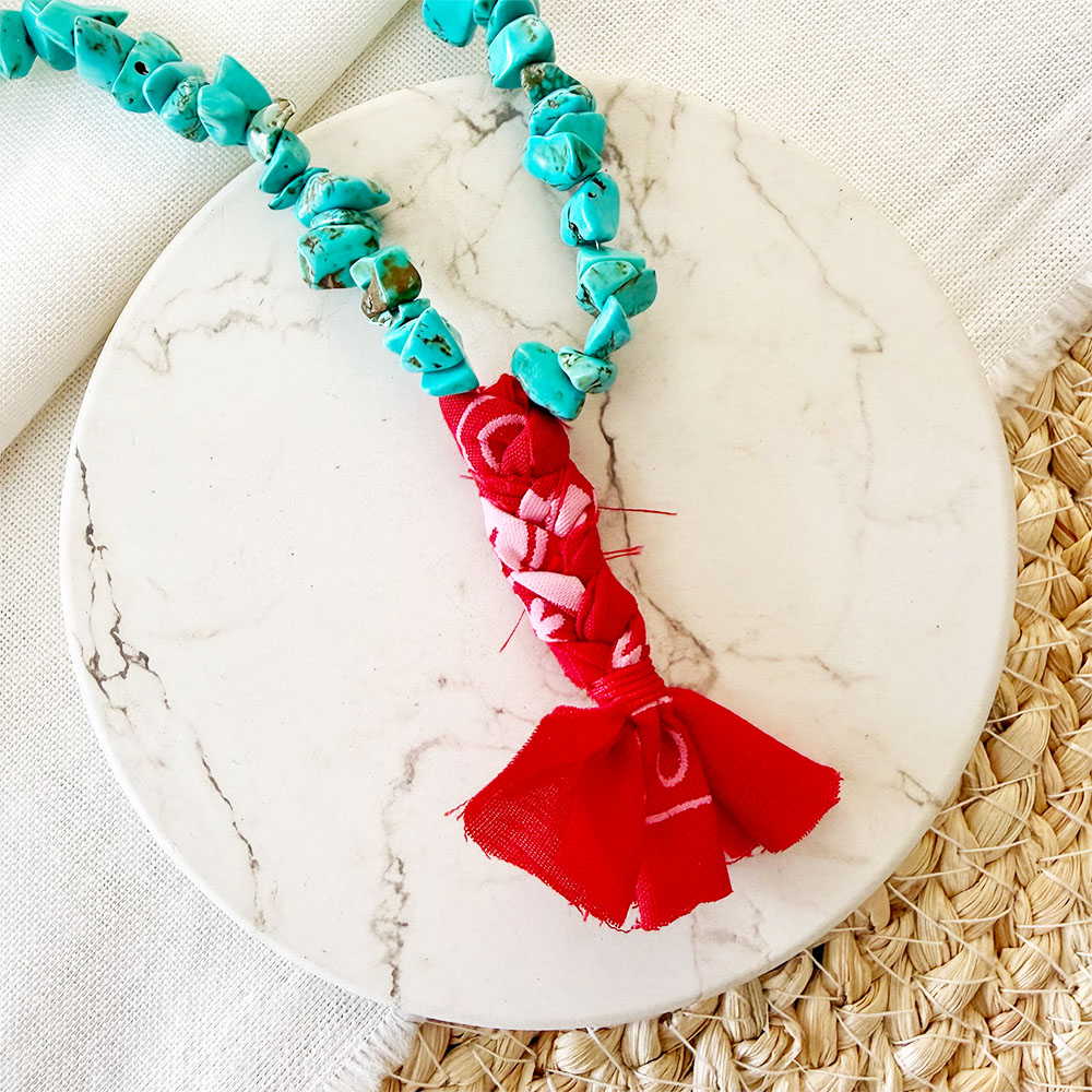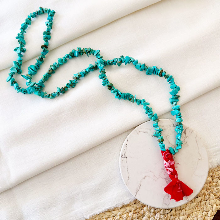Collares, Collares, Hombre, Lo último, MujerCollar largo, base en micro cordón de seda y turquesas chips irregulares naturales y pompon en pañoleta de lino roja. Cuidados: Para una mayor durabilidad de nuestras piezas, se debe evitar el contacto con: Agua de Mar, piscina, cremas, perfumes, alcohol y cualquier tipo de líquidos que puedan deteriorarla. Cada vez que se use se recomienda limpiar con paño suave y seco y en este caso mantener colgado, no dormir con el puesto y no mezclar al guardarse con otras piezas, podría enredarse o deformarse. COLECCIÓN: COLOMBIAN LOVERS. Producto hecho 100% a mano en Colombia.$85,000.00 -