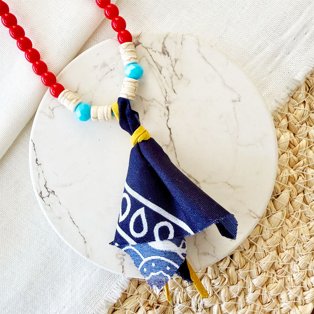 Collares, Lo último, MujerCollar corto, base en pañoleta (bandana) texana en lino, anudada y con terminales para collar en acero plateado con extensión para ajuste, multi dijes en diferentes tamaños, materiales y formas. Cuidados: Para una mayor durabilidad de nuestras piezas, se debe evitar el contacto con: Agua de Mar, piscina, cremas, perfumes, alcohol y cualquier tipo de líquidos que puedan deteriorarla. Cada vez que se use se recomienda limpiar con paño suave y seco y en este caso mantener colgado, no dormir con el puesto y no mezclar al guardarse con otras piezas, podría enredarse o deformarse. COLECCIÓN: COLOMBIAN LOVERS. Producto hecho 100% a mano en Colombia.$82,000.00 -
