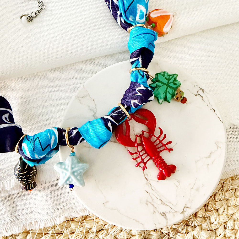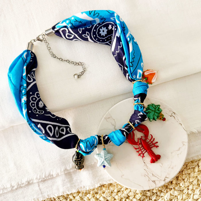 Collares, Lo último, MujerCollar corto, base en pañoleta (bandana) texana en lino, anudada y con terminales para collar en acero plateado con extensión para ajuste, multi dijes en diferentes tamaños, materiales y formas. Cuidados: Para una mayor durabilidad de nuestras piezas, se debe evitar el contacto con: Agua de Mar, piscina, cremas, perfumes, alcohol y cualquier tipo de líquidos que puedan deteriorarla. Cada vez que se use se recomienda limpiar con paño suave y seco y en este caso mantener colgado, no dormir con el puesto y no mezclar al guardarse con otras piezas, podría enredarse o deformarse. COLECCIÓN: COLOMBIAN LOVERS. Producto hecho 100% a mano en Colombia.$82,000.00 -