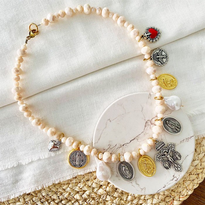 Collares, Lo último, MujerCollar corto en base guaya metalica y mix de rondelas en cristales de murano de diferentes tamaños, mezcla de dijes en zamack, acero dorado y plateado, rodio, bronce con baño en oro y resina, argolla y extensión en acero dorado. MEDIDAS: 50 cm, aproximadamente. COLECCIÓN: INDULGENCIAS Cuidados: Para una mayor durabilidad de nuestras piezas, se debe evitar el contacto directo con: Agua de Mar, piscina, cremas, perfumes, alcohol y cualquier tipo de líquidos que puedan deteriorarla. Cada vez que se use se recomienda limpiar con paño suave y seco. A mayor cuidado, mayor durabilidad. Producto hecho 100% a mano en COLOMBIA.$98,000.00 -
