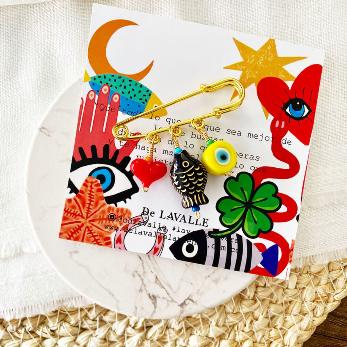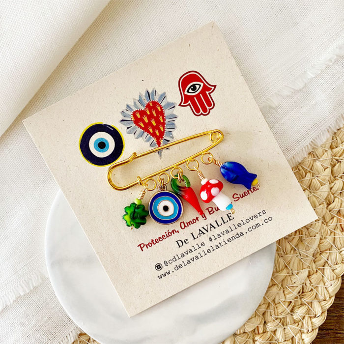 Lo último, PINESPin prendedor en forma de gancho con base en bronce con baño en oro y dijes colgantes en cristales checos en forma de hongo rojo, chile (ají) ojo turco, pez y trébol. COLECCIÓN: PARTY CHARMS / RELICARIO Cuidados: Para una mayor durabilidad de nuestras piezas, se debe evitar el contacto directo con: Agua de Mar, piscina, cremas, perfumes, alcohol y cualquier tipo de líquidos que puedan deteriorarla. Cada vez que se use se recomienda limpiar con paño suave y seco. A mayor cuidado, mayor durabilidad. Producto hecho 100% a mano en COLOMBIA.$55,000.00 -