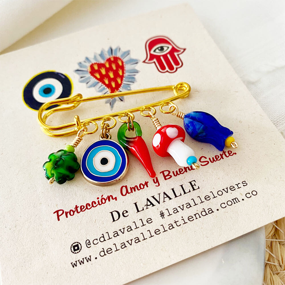 Lo último, PINESPin prendedor en forma de gancho con base en bronce con baño en oro y dijes colgantes en cristales checos en forma de hongo rojo, chile (ají) ojo turco, pez y trébol. COLECCIÓN: PARTY CHARMS / RELICARIO Cuidados: Para una mayor durabilidad de nuestras piezas, se debe evitar el contacto directo con: Agua de Mar, piscina, cremas, perfumes, alcohol y cualquier tipo de líquidos que puedan deteriorarla. Cada vez que se use se recomienda limpiar con paño suave y seco. A mayor cuidado, mayor durabilidad. Producto hecho 100% a mano en COLOMBIA.$55,000.00 -