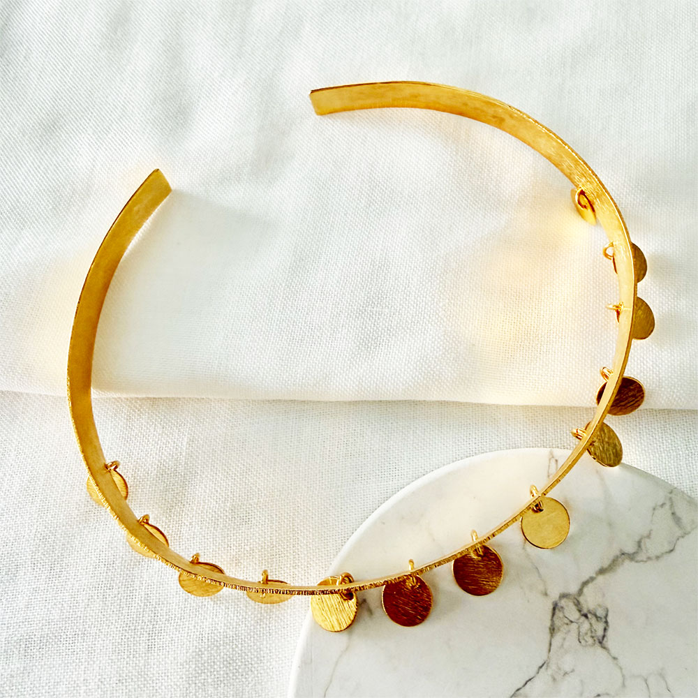 Collares, MujerChoker de lamina y mini moneditas en base de bronce con baño en oro ajustable. Colección: SOLSTICIO. Cuidados: Para una mayor durabilidad de nuestras piezas, se debe evitar el contacto directo con: Agua de Mar, piscina, cremas, perfumes, alcohol y cualquier tipo de líquidos que puedan deteriorarla. Cada vez que se use se recomienda limpiar con paño suave y seco. A mayor cuidado, mayor durabilidad. Producto hecho 100% a mano en Colombia.$120,000.00 -
