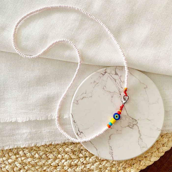Collares, Collares, Hombre, MujerCollar en base de micro cordón de seda rojo, mix de chaquiras checas blancas mini. Boche y argolla en acero plateado. MEDIDAS: estándar, 45 cm de largo aproximadamente. COLECCIÓN: HOMBRES DE LAVALLE Cuidados: Para una mayor durabilidad de nuestras piezas, se debe evitar el contacto directo con: Agua de Mar, piscina, cremas, perfumes, alcohol y cualquier tipo de líquidos que puedan deteriorarla. Cada vez que se use se recomienda limpiar con paño suave y seco. A mayor cuidado, mayor durabilidad. Producto hecho 100% a mano en COLOMBIA.$55,000.00 -