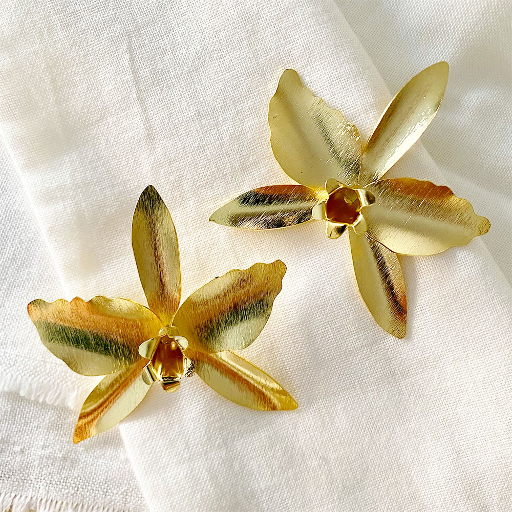 Aretes en base bronce con baño en oro dorado de 24 quilates, calados y texturizados a mano. Sistema de topo con pin.