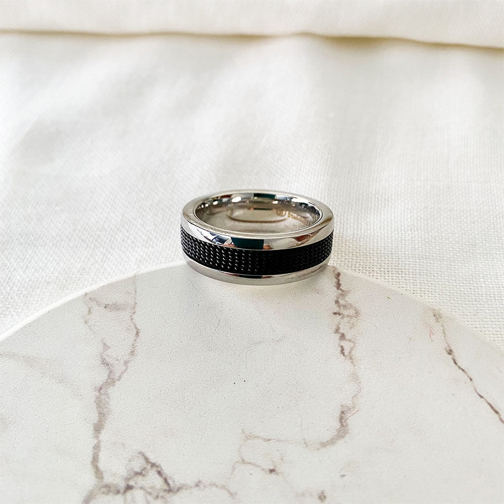 Anillo base en acero plateado e incrustación de acero quemado.