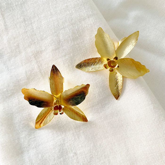 Aretes en bronce con baño en oro de 24 kts, calada y texturizada a mano en acabado lijado mate, sistema de topo con pin.