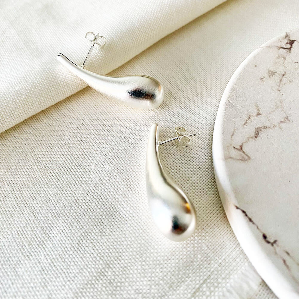 Aretes en base de bronce con baño en oro blanco mate calados y texturizado a mano, sistema de topo con pin.