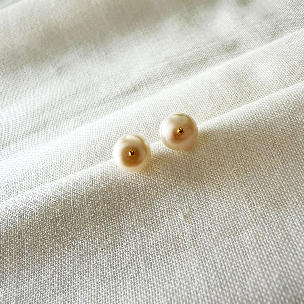 Aretes topos sencillos en perla natural color beige, base en acero plateado y sistema de pin.