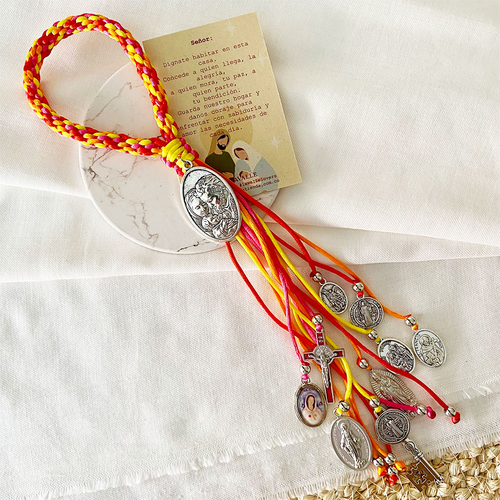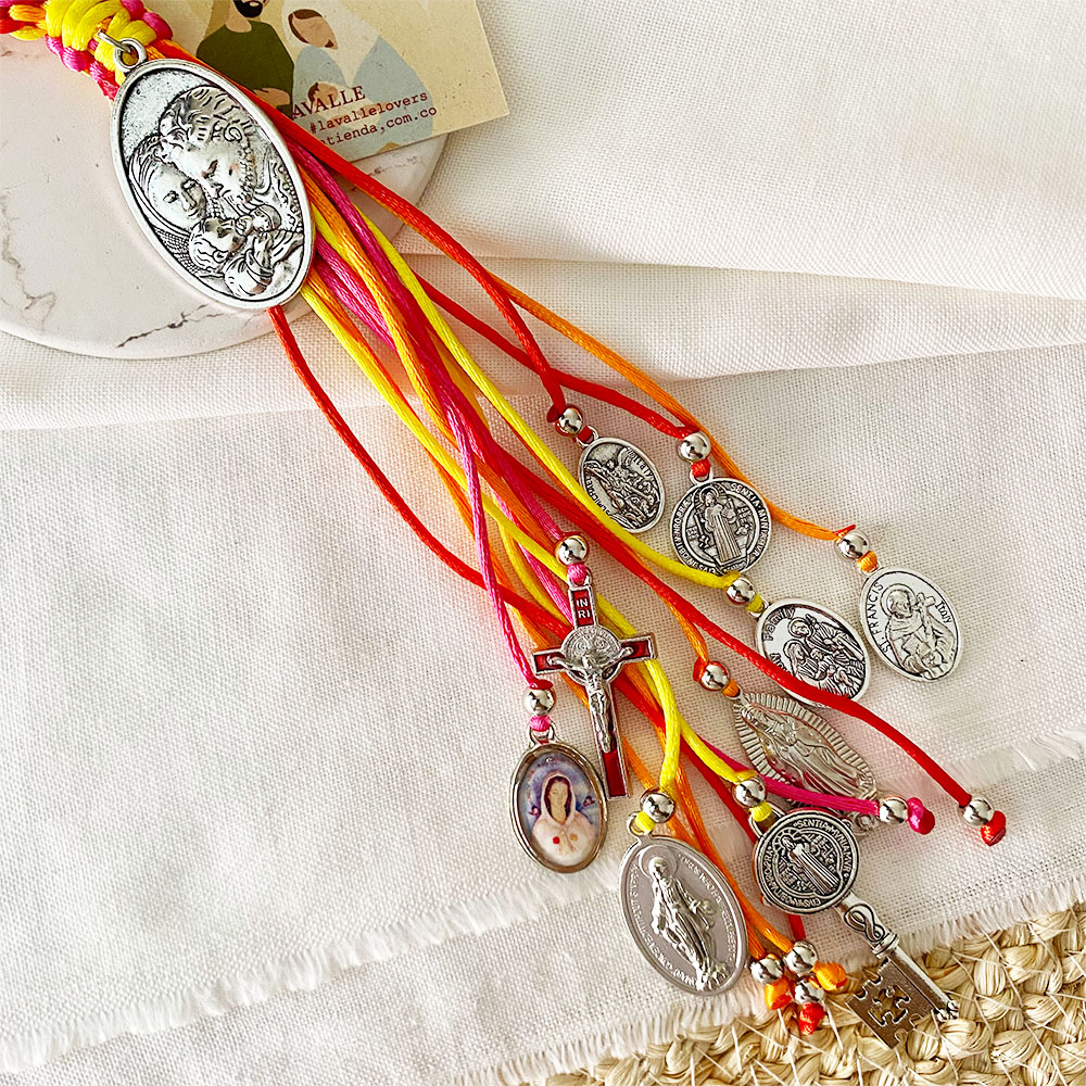 Bendición del hogar en cordones de seda de colores mix, multi medallas religiosas en zamak plateado de: San Benito, Virgen Milagrosa, Guadalupe, Rosa Mística, San Francisco, San Antonio, Sagrada Familia, Espíritu Santo, San Miguel, Angel de La Guarda y Sagrado Corazón.