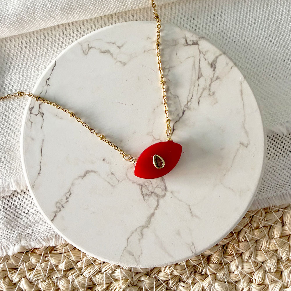 Cadena corta en bronce con baño en oro y dije en forma de ojo en agata roja con micro circon, sistema de broche con extensión para ajuste.