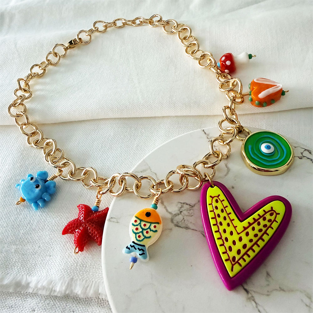 Cadena en aluminio con baño en oro dorado, mix de charms en diferentes materiales, estrella, moneda de luna, concha de mar en bronce con baño en oro, limón y langosta en acrílico, corazón, ojo y peces en cristal checo.