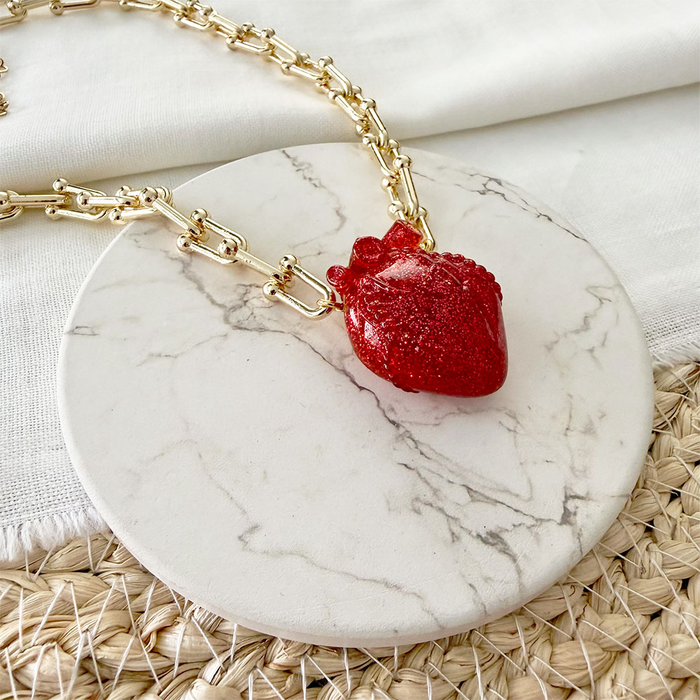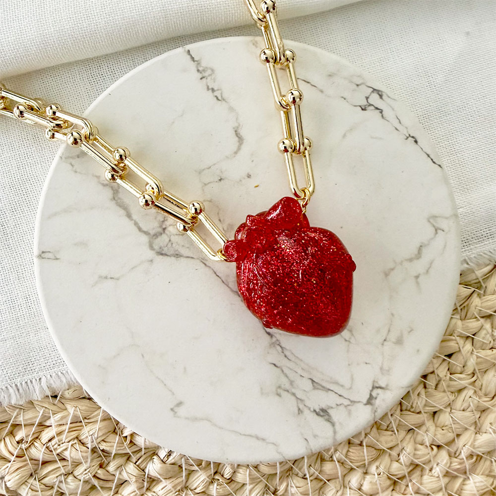 Cadena corta en bronce con baño en oro gruesa y dije en forma de corazón en resina escarchada, sistema de broche con extensión para ajuste.