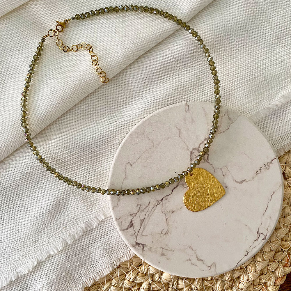Collar corto o choker en cristales de murano color humo (plateado) de 4mm, dije en forma de corazón en bronce calado y texturizado martillado a mano con baño en oro de 24 klts, broche y cadena extensora en acero dorado ley 304 antialérgica.