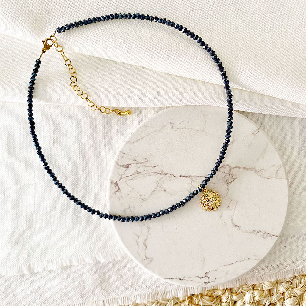 Collar corto con base en guaya metálica, cristales de murano 2 mm facetados, broche, argolla y dije en forma de ojo con cristal en bronce con baño en oro.