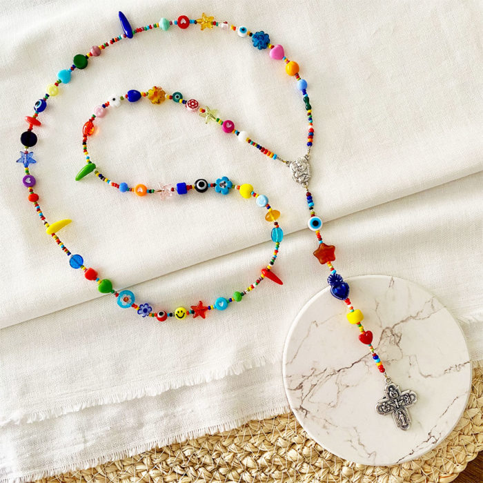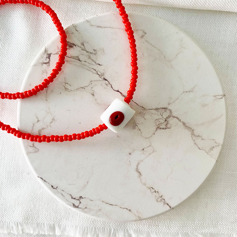 Collar corto en base de micro cordon de seda rojo, mix de chaquiras checas, dije pasante en forma de ojo turco en vidrio artesanal, broche y argolla en acero plateado.