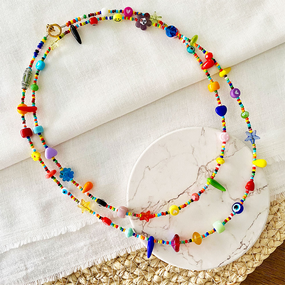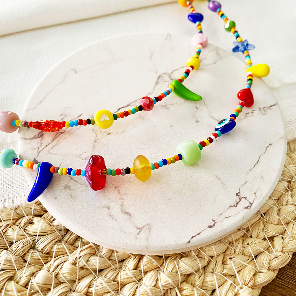 Collar en base guaya metálica, mix de chaquiras checas y multidijes en diferentes materiales, acrílico, cristales, muranos, piedras naturales, vidrios y azabaches.
