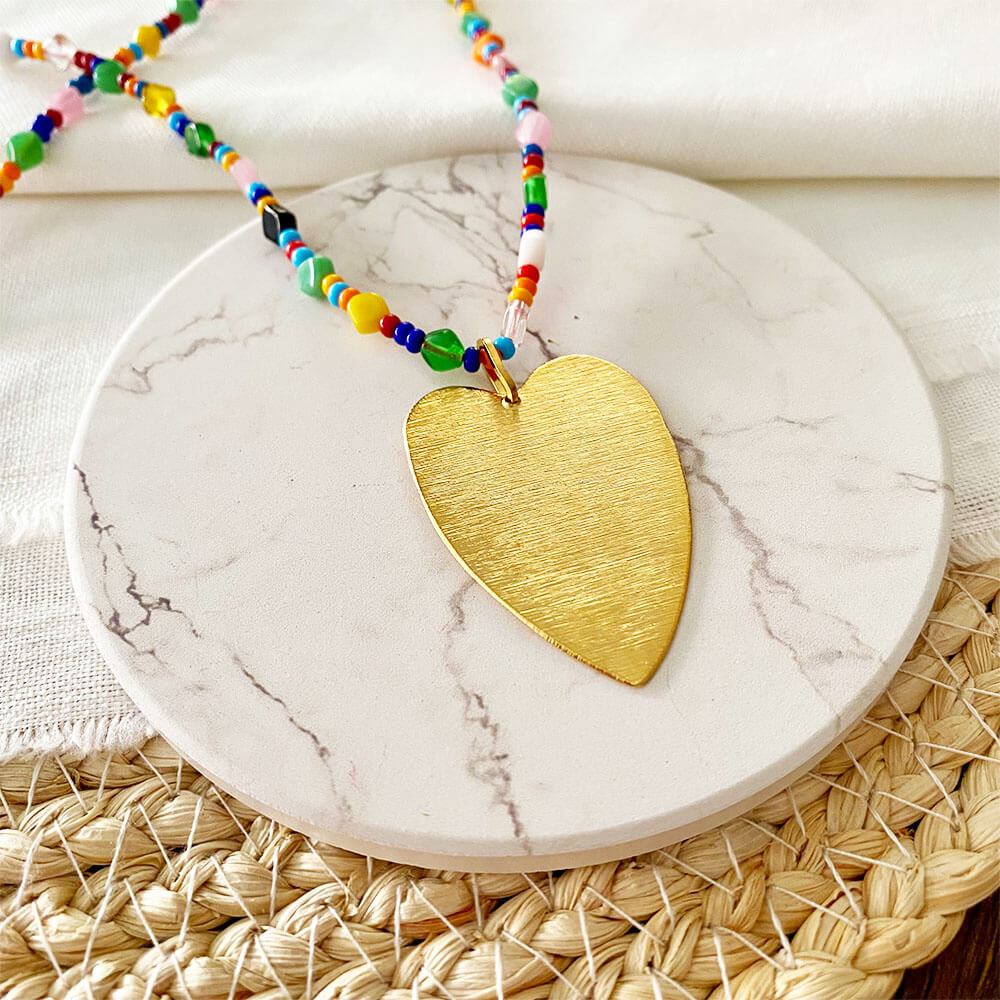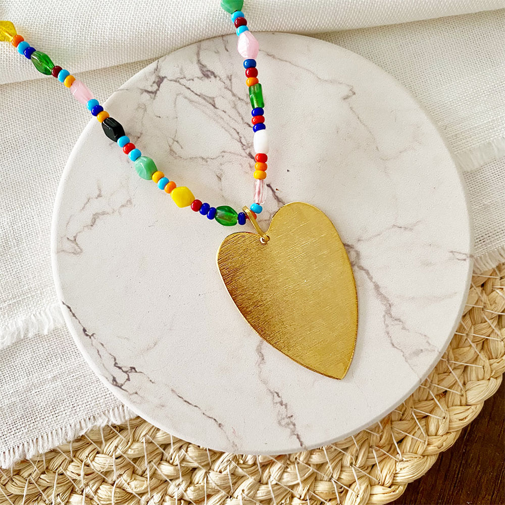 Collar base en micro cordón de seda, mini cristales hindu irregulares, mix de chaquiras checas y dije colgante en forma de corazón en bronce con baño en oro, calado y texturizado a mano, broche y argolla en acero dorado.