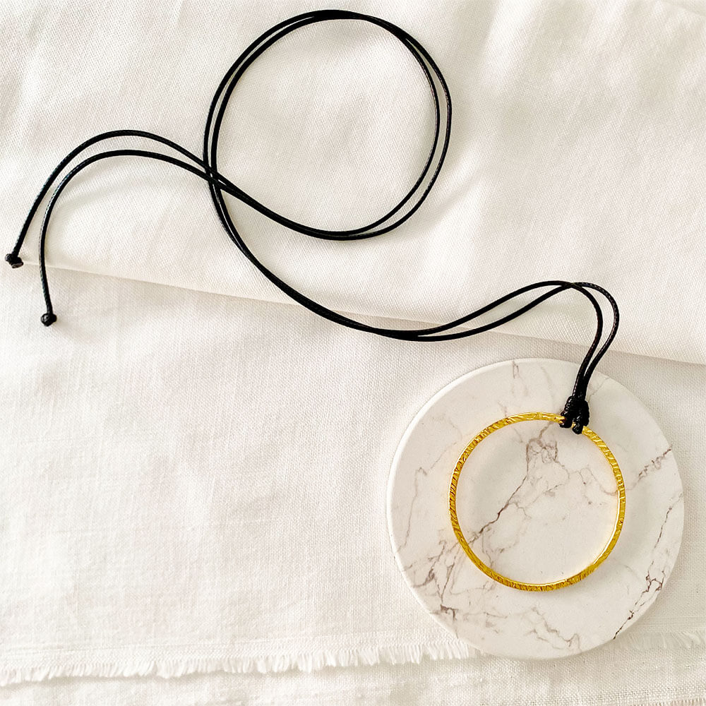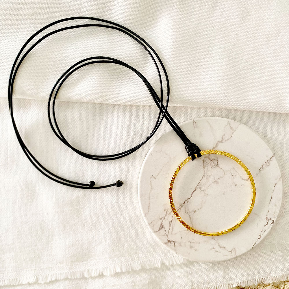Collar largo en cuero de víbora sintética negro y dije de aro en base bronce con baño en oro dorado. Sistema de amarre manual.