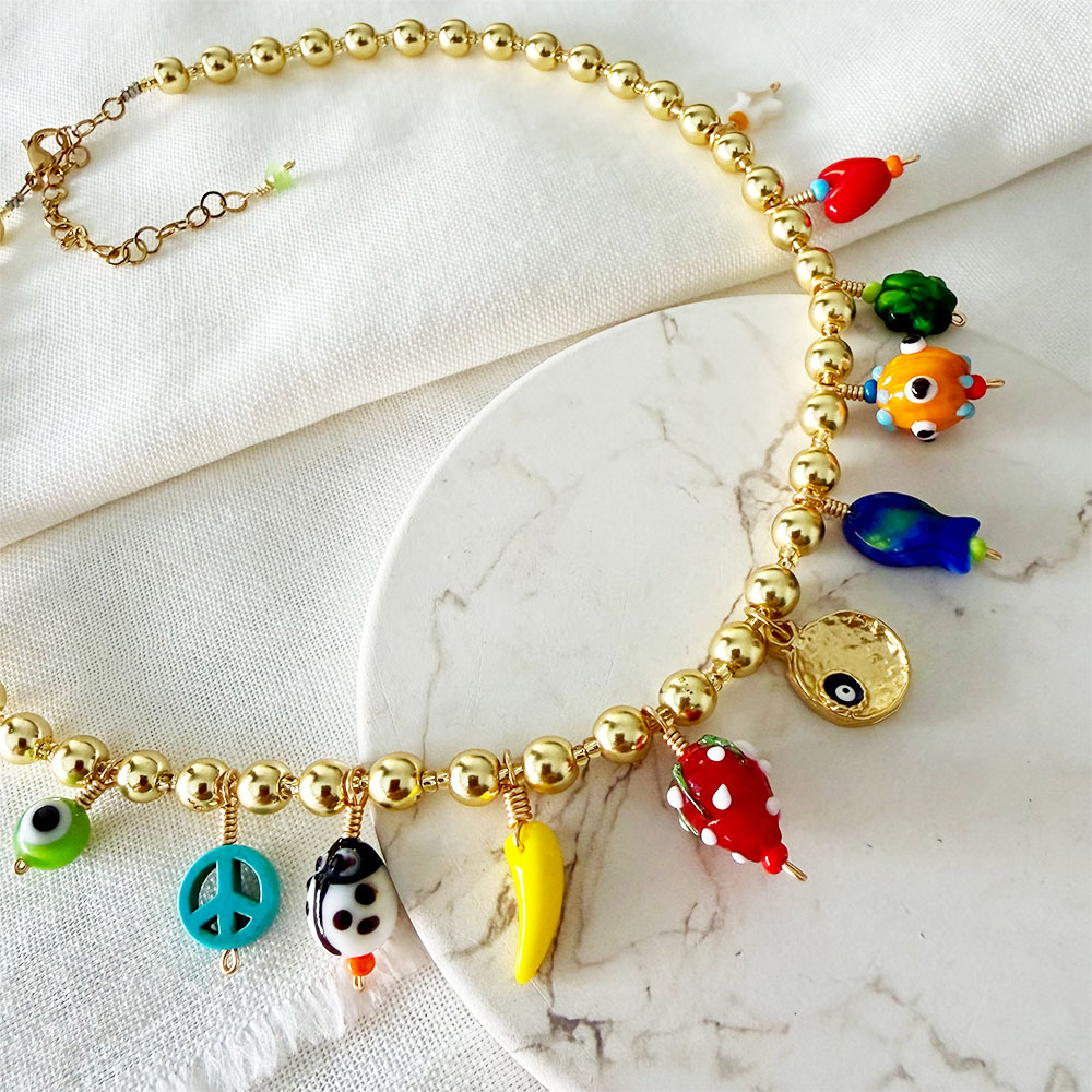Collar corto, base en guaya metálica, acerina con baño en oro dorado y mix de dijes en murano, cristales, vidrio, acrilico, resina y ceramica. sistema de broche, argolla y extensión en acero dorado.