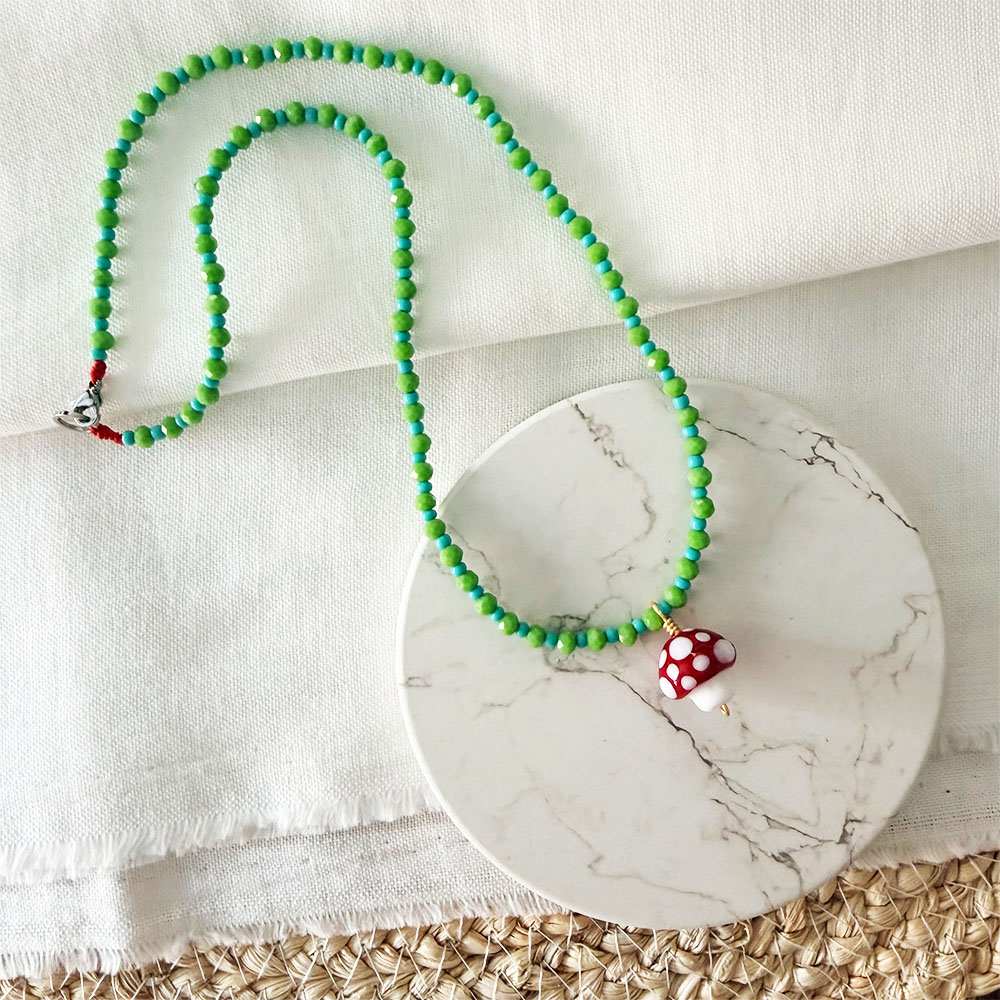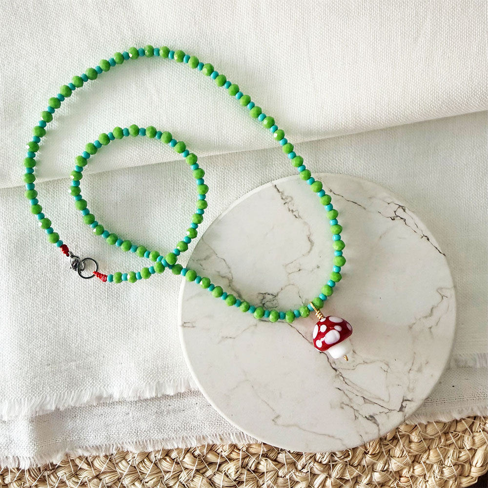Collar corto base en cordón,, mix de cristales de murano y chaquiras checas, dije colgante en forma de hongo en vidrio y broche en acero.