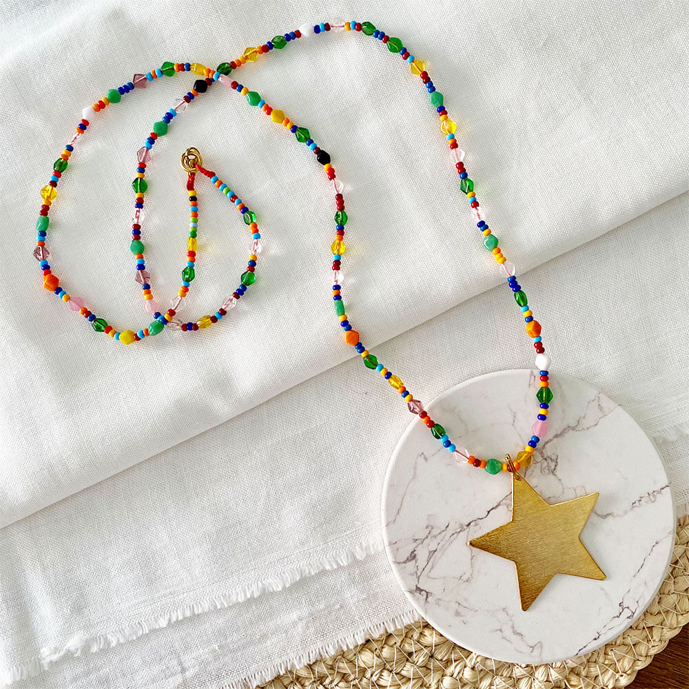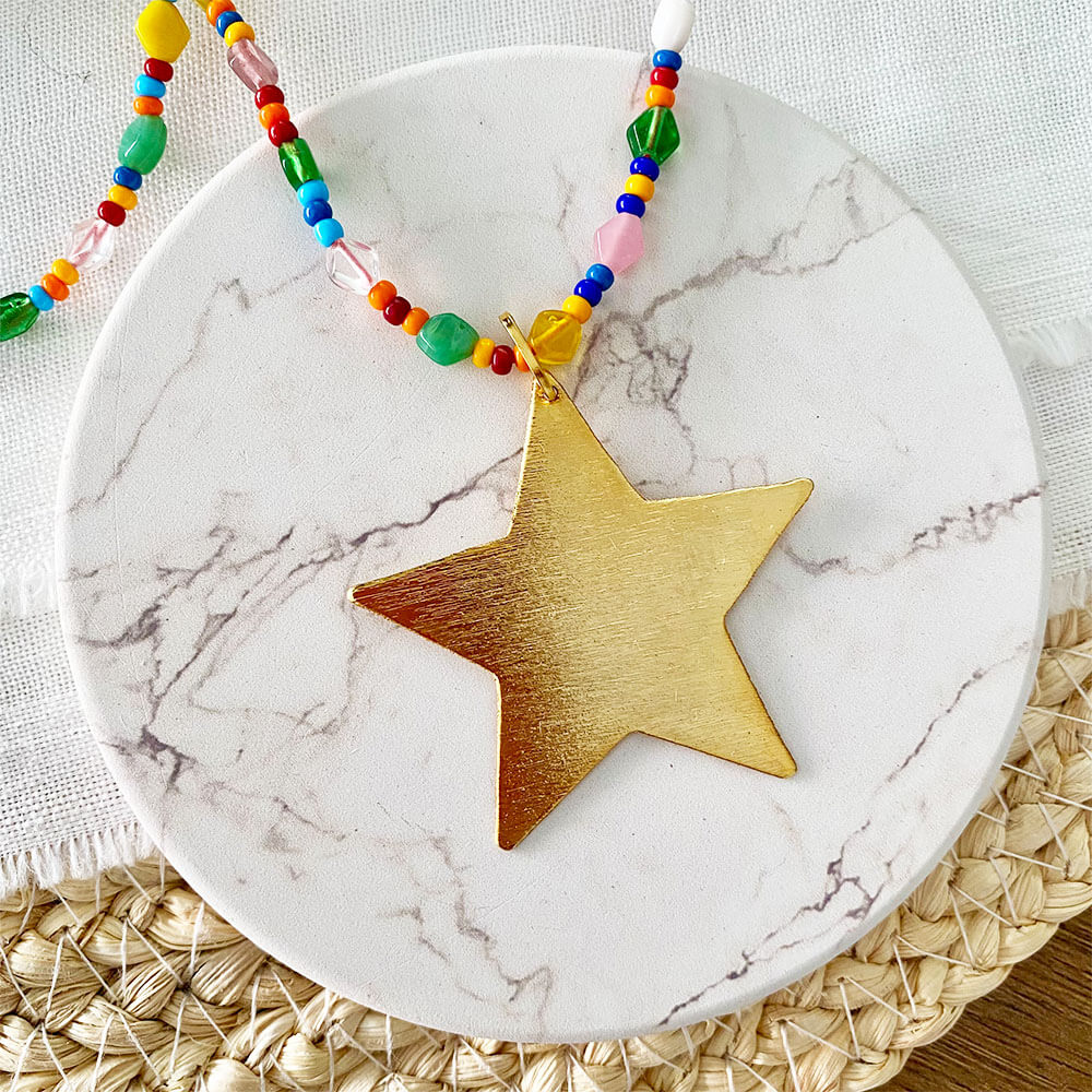 Collar base en micro cordón de seda, mini cristales hindu irregulares, mix de chaquiras checas y dije colgante en forma de estrella en bronce con baño en oro, calado y texturizado a mano, broche y argolla en acero dorado.