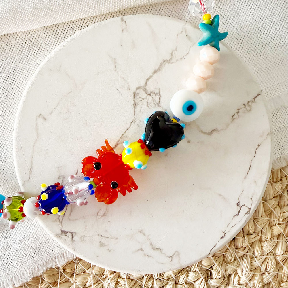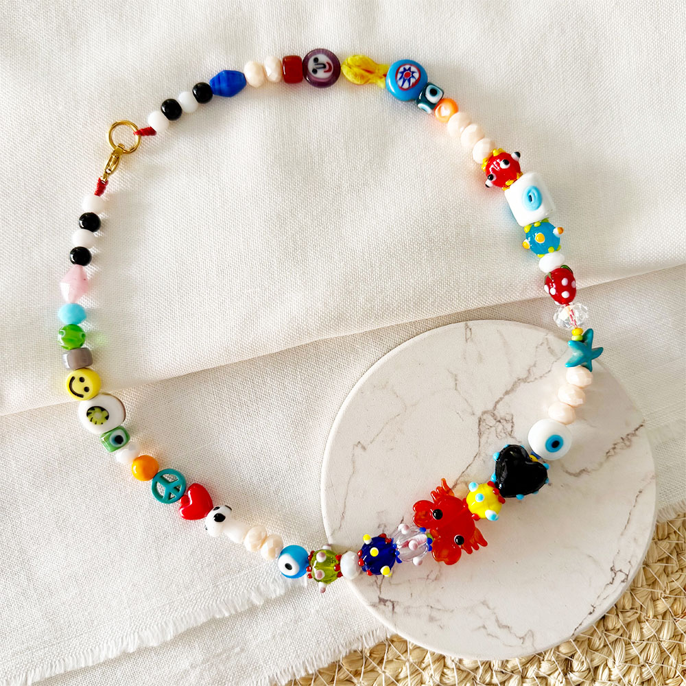 Collar corto, base en micro cordón, mix chaquiras checas y cristales de murano, dijes en vidrio, acrilico, resina, cristal y ceramica. sistema de broche y argolla en acero dorado.