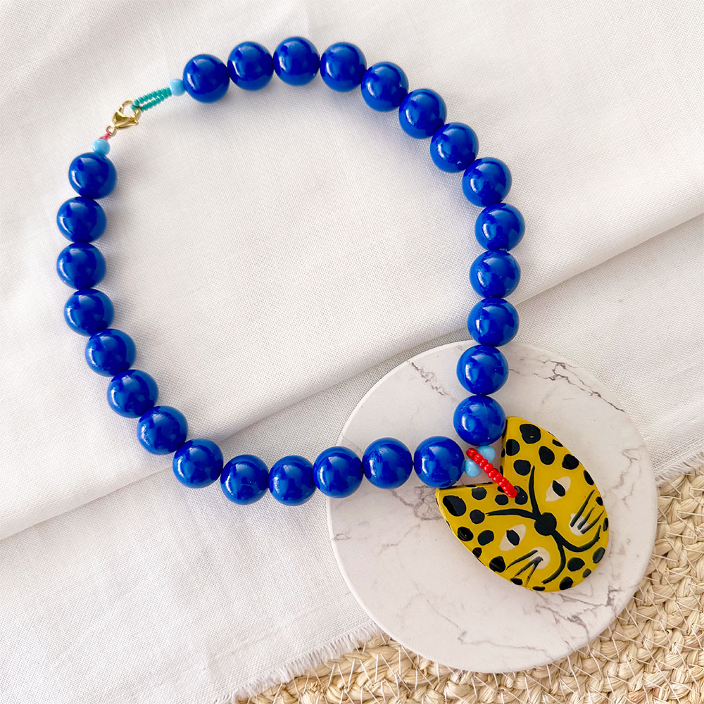 Collar corto, base micro cordon de seda, esferas de acrilico en diferentes tonos de 16 mm, dije colgante en base madera, pintado y detallado a mano en acrilico y resinado, hecho 100% a mano por artesanos ancestrales con experiencia en mascaras y adornos del carnaval de Barranquilla en malanbo atlantico.