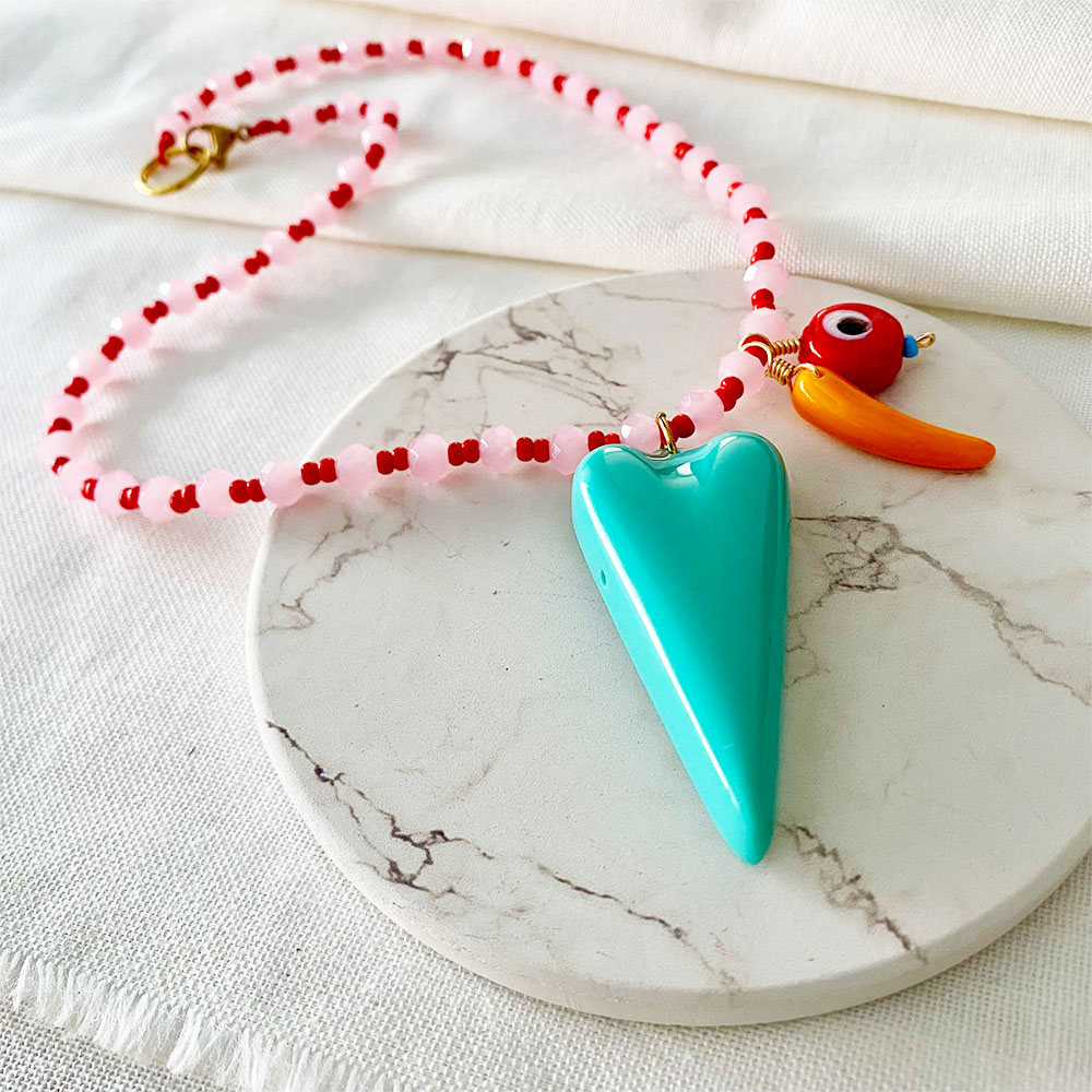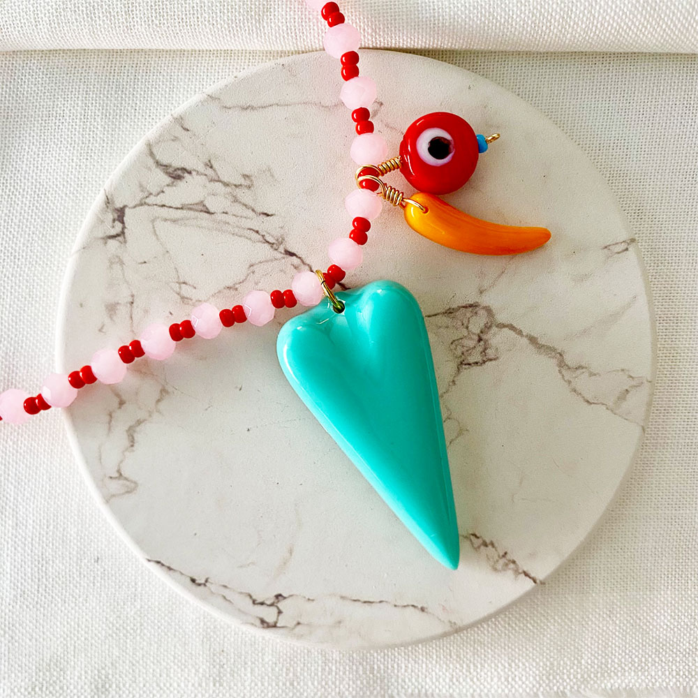 Collar corto, base en micro cordon de seda, cristales de murano facetado y chaquiras checas, dijes de corazon grande en resina, azabache y ojo turco en cristal artesanal, argollas, broche y extensión en acero dorado.