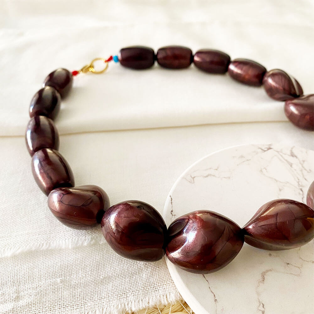 Collar corto en base cordón, esferas irregulares en Acrílico perlado, broche en bronce con baño en oro.