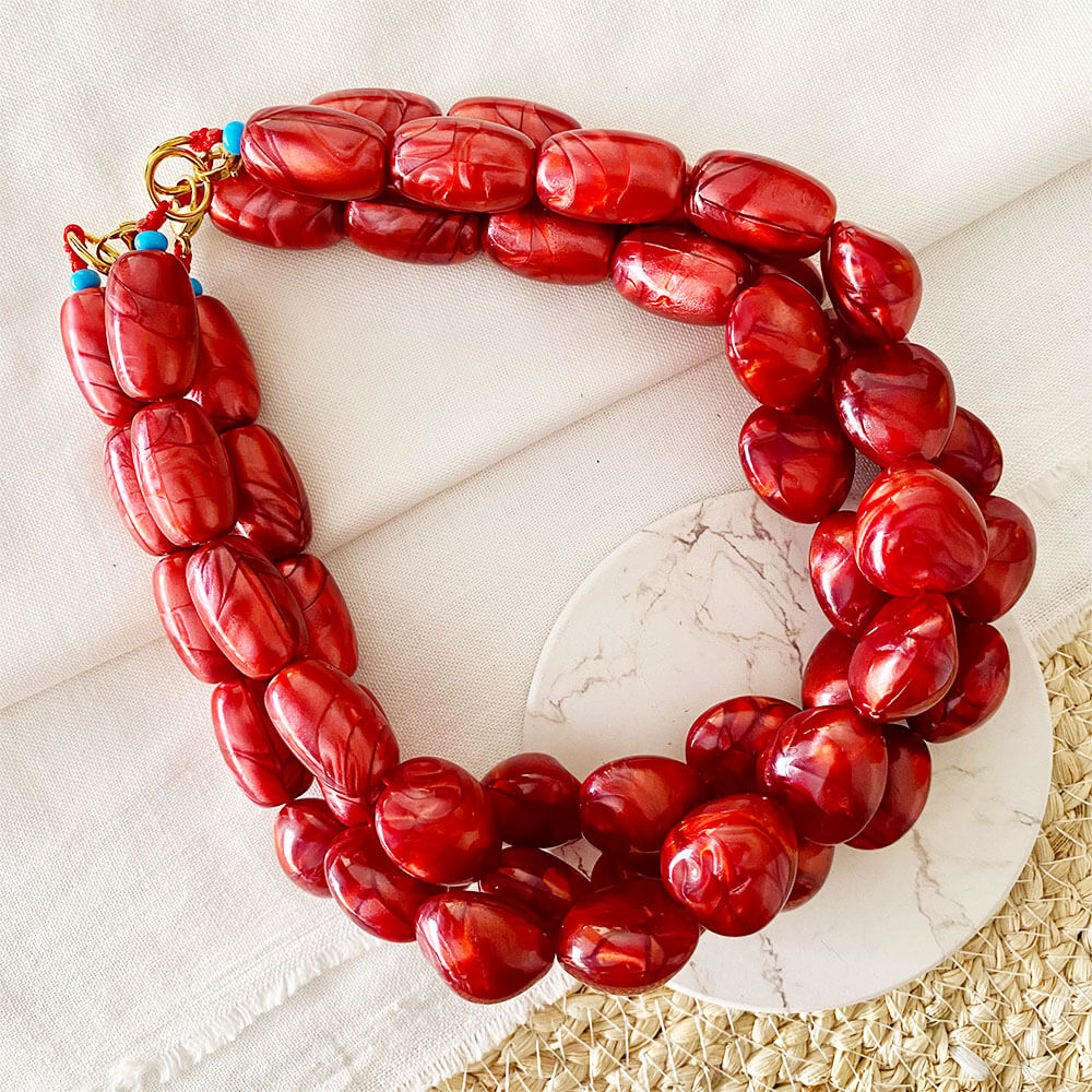 Trio de Collares individuales cortos en base cordón, esferas irregulares en Acrílico perlado, broche en bronce con baño en oro.
