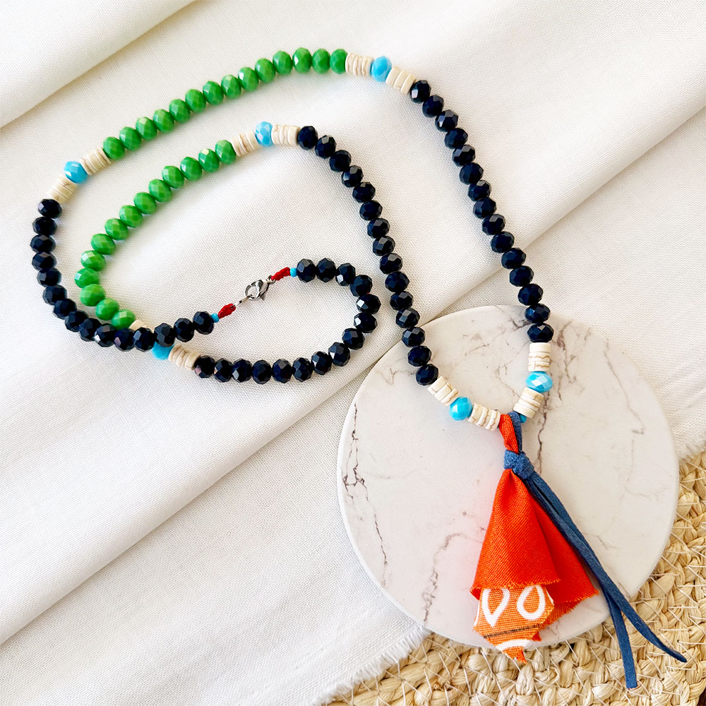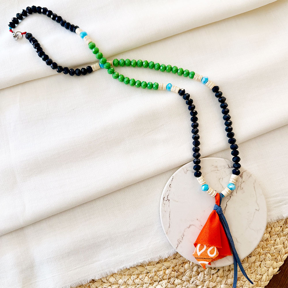 Collar largo, base en micro cordón de seda, ojo de gato negro #6 mm, mix de cristales murano facetados, arandelas de fósil blanco y retazos de pañoleta texanas, sistema de broche en acero plateado.
