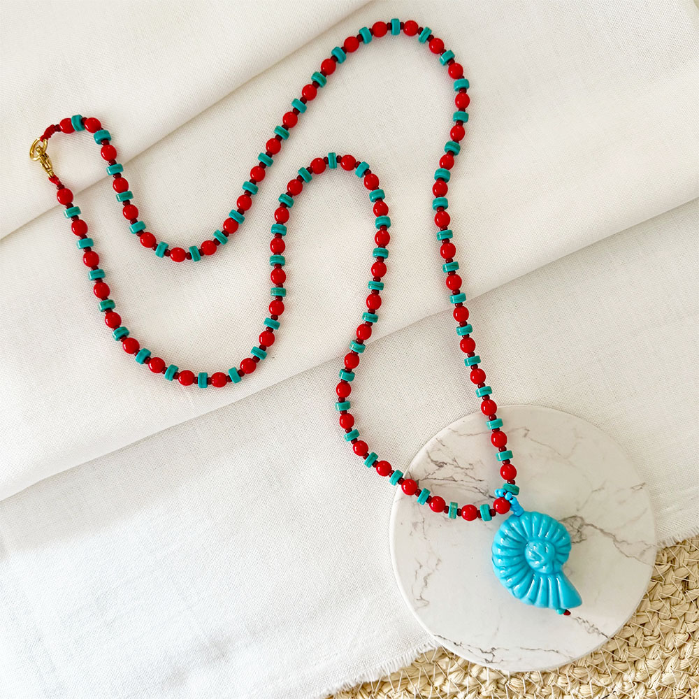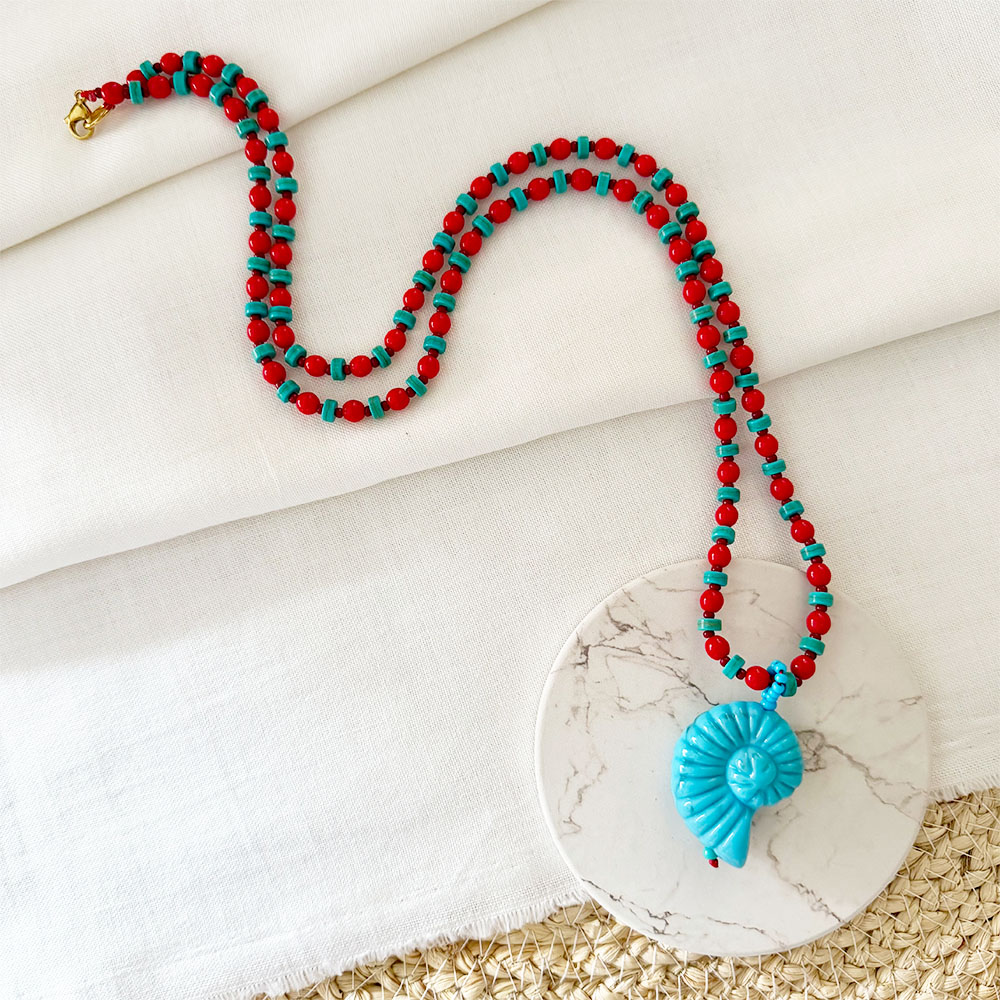 Collar largo, base en micro cordón de seda, mix de cristales rojos, chaquiras checas y tuercas turquesas, dije colgante en forma de caracol en resina celeste, broche y argolla en acero dorado.