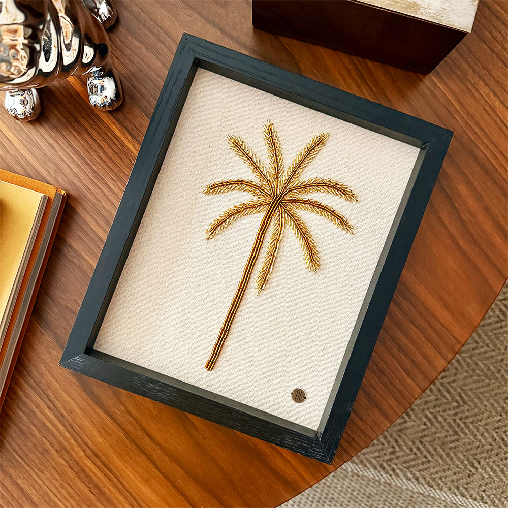 Cuadro decorativo bordado 100% a mano en canutillos checos sobre lienzo de lino, marco y respaldo en madera negra.