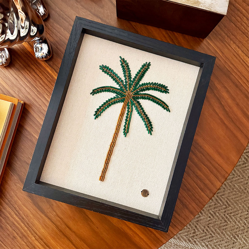 Cuadro decorativo bordado 100% a mano en canutillos checos sobre lienzo de lino, marco y respaldo en madera negra.