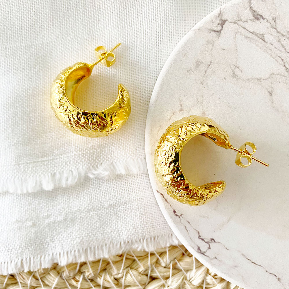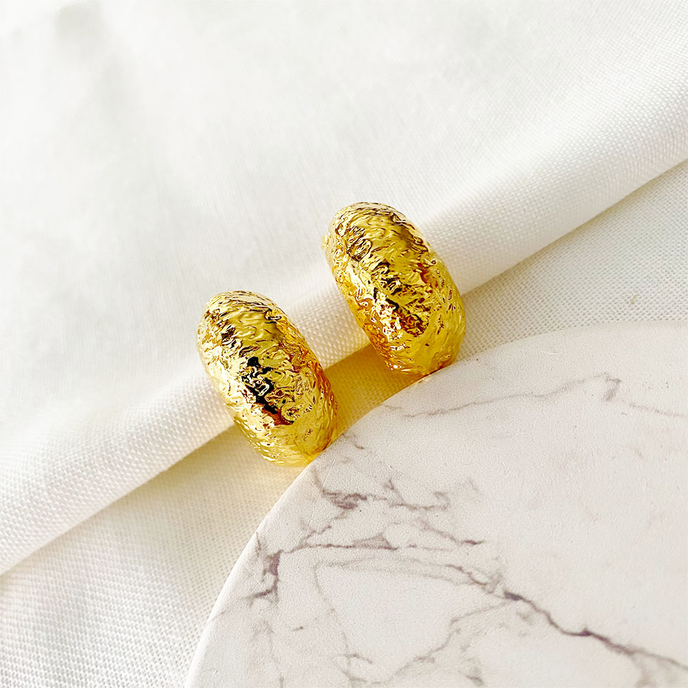 Candonga, arracada o argolla de acabado rustico en base de bronce con baño en ORO, calada y texturizada a mano, sistema de topo con pin.