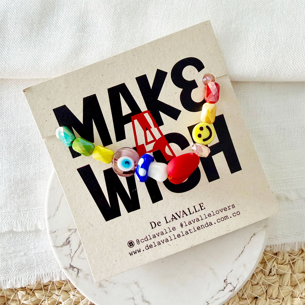 Manilla en micro cordón de seda rojo, mix de cristales de murano, dijes de vidrio, cerámica y acrílico. Sistema de nudo corredizo para ajuste.