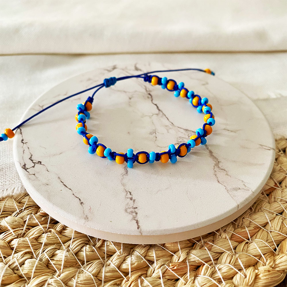 Manilla típica de playa pero a otro nivel. Base en macrame de micro cordon de seda intercalada con chaquiras checas #6 y #8 de diferentes tonos. Sistema de nudo corredizo para ajuste.