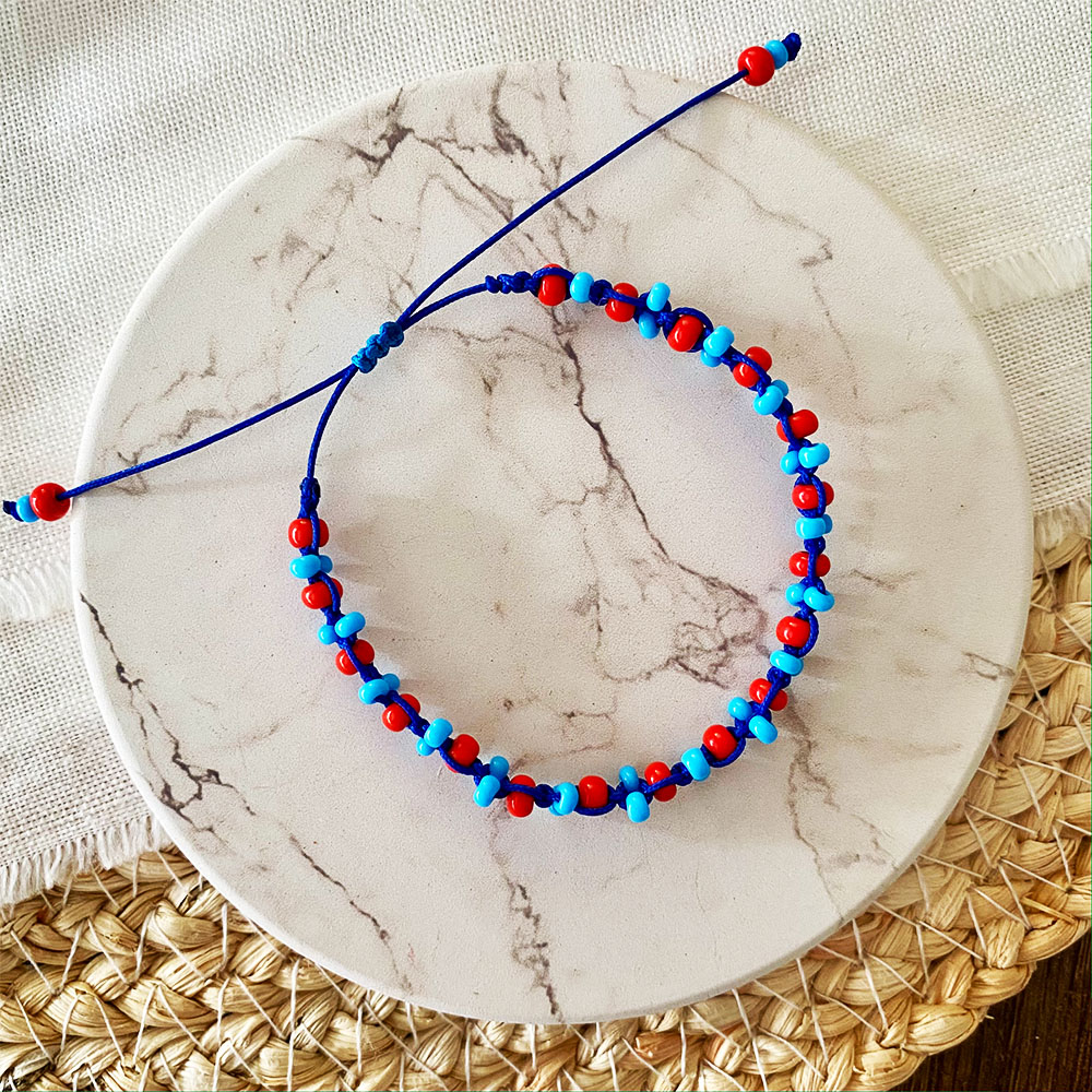 Manilla típica de playa pero a otro nivel. Base en macrame de micro cordon de seda intercalada con chaquiras checas #6 y #8 de diferentes tonos. Sistema de nudo corredizo para ajuste.