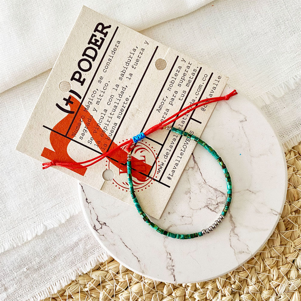 Manilla base en guaya metálica y micro cordón de seda rojo, chaquiras en ceramica Turca artesanal en diferentes tonos y 7 balines en acero plateado. Sistema de nudo corredizo para ajuste.