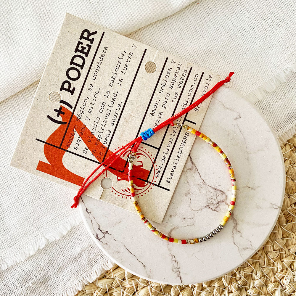 Manilla base en guaya metálica y micro cordón de seda rojo, chaquiras en ceramica Turca artesanal en diferentes tonos y 7 balines en acero plateado. Sistema de nudo corredizo para ajuste.