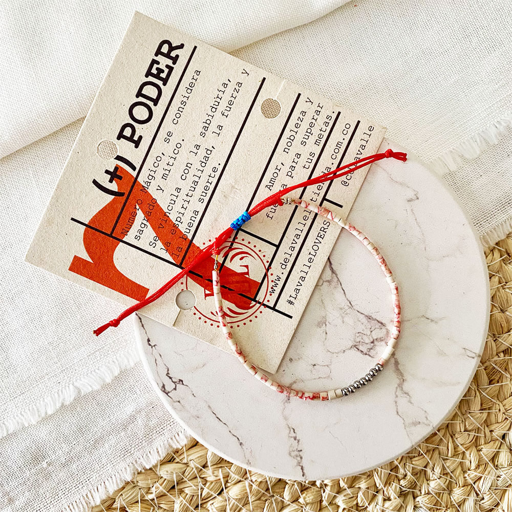 Manilla base en guaya metálica y micro cordón de seda rojo, chaquiras en ceramica Turca artesanal en diferentes tonos y 7 balines en acero plateado. Sistema de nudo corredizo para ajuste.