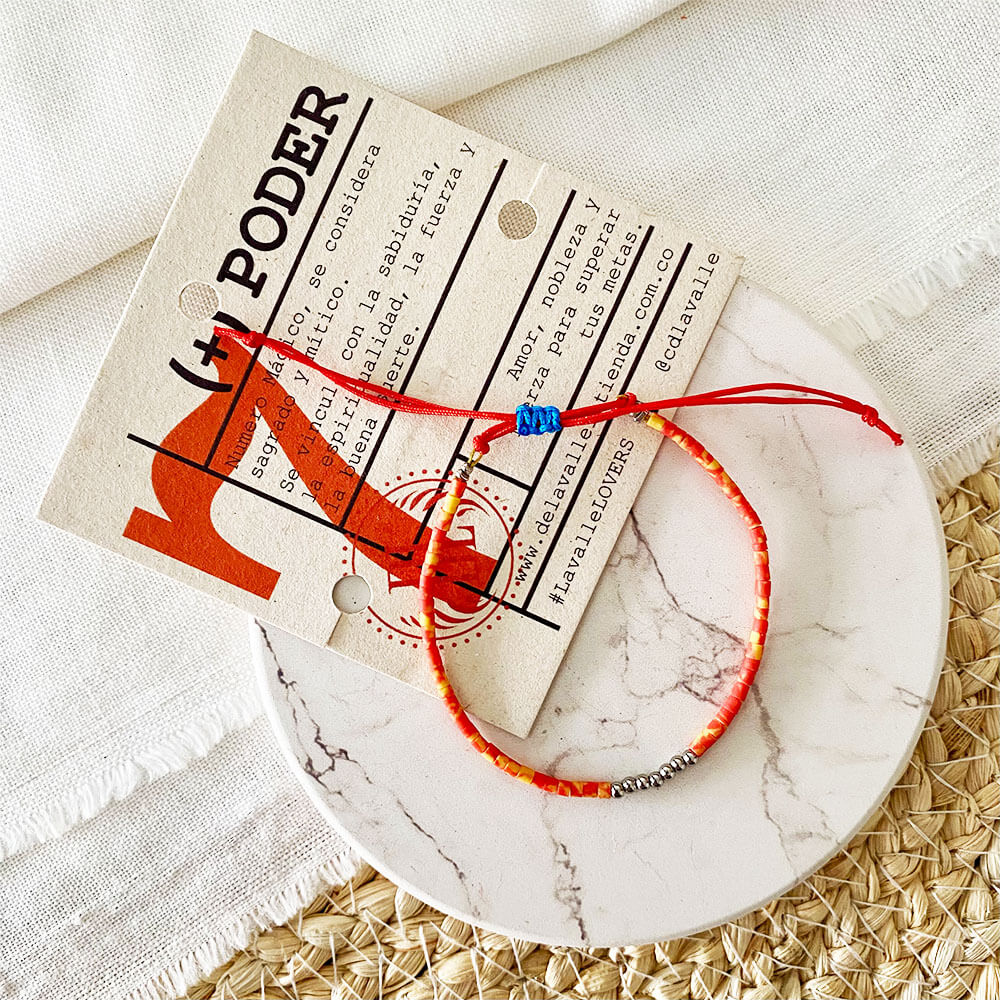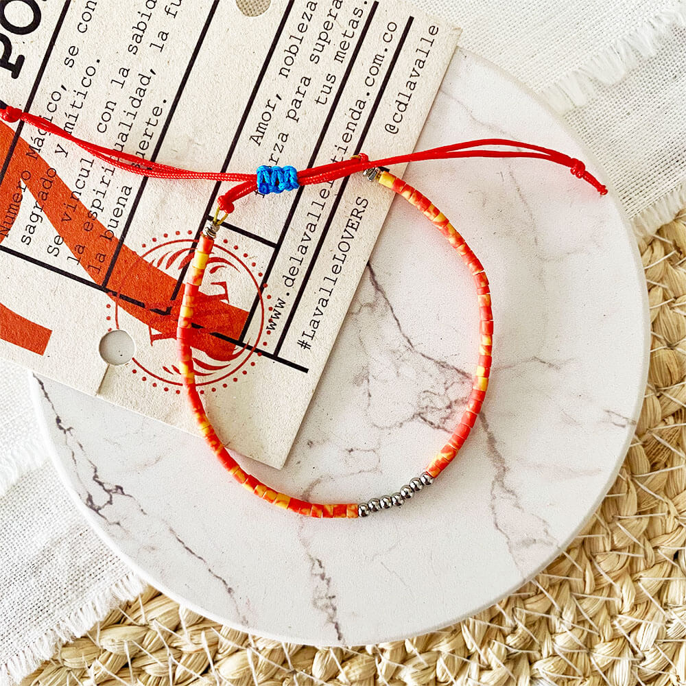 Manilla base en guaya metálica y micro cordón de seda rojo, chaquiras en ceramica Turca artesanal en diferentes tonos y 7 balines en acero plateado. Sistema de nudo corredizo para ajuste.