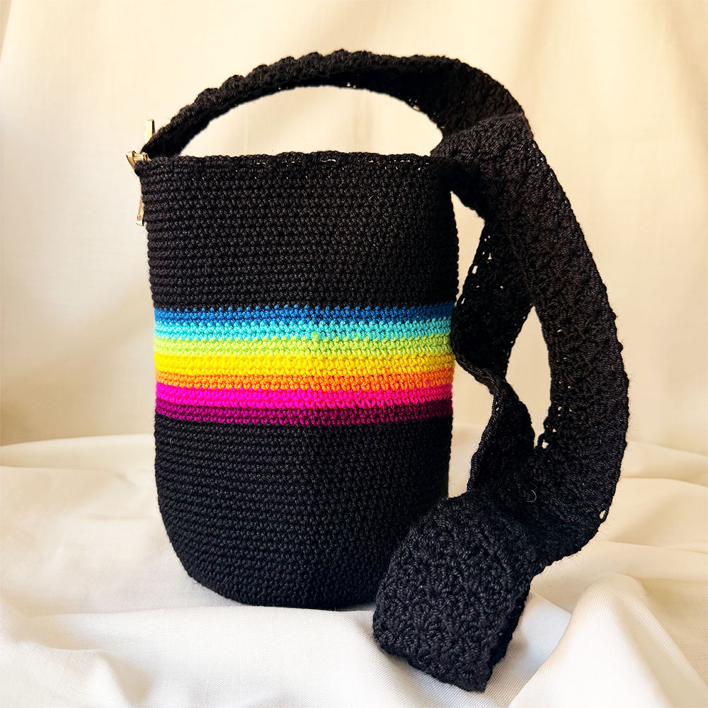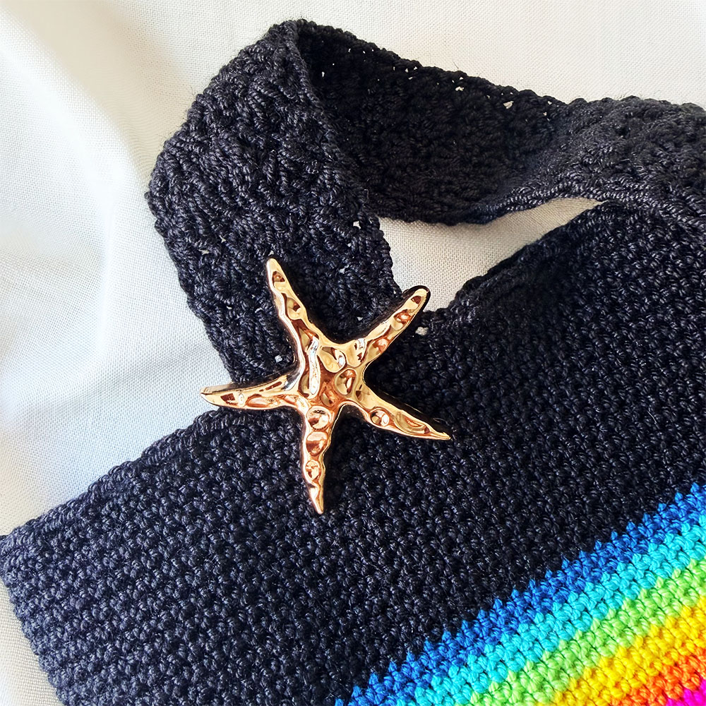 Mochila Colombiana tejida 100% a mano en técnica crochet en hilos de algodón en diferentes tonos, Tejido a medio punto, Manija o haza larga y dije pasador en forma de estrella de mar.