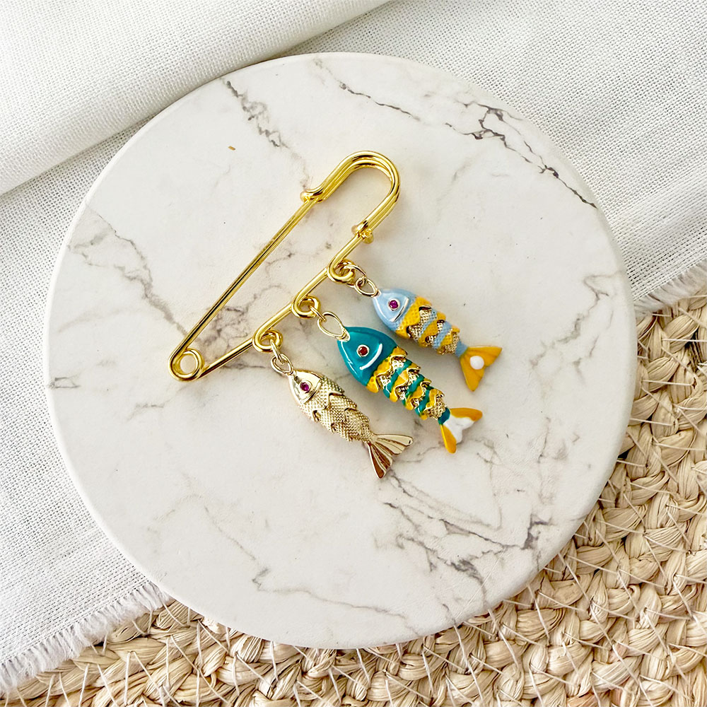 Pin prendedor en forma de gancho y 3 dijes en forma de peces articulados, dos recubiertos en porcelana y los 3 con base en bronce con baño en oro.
