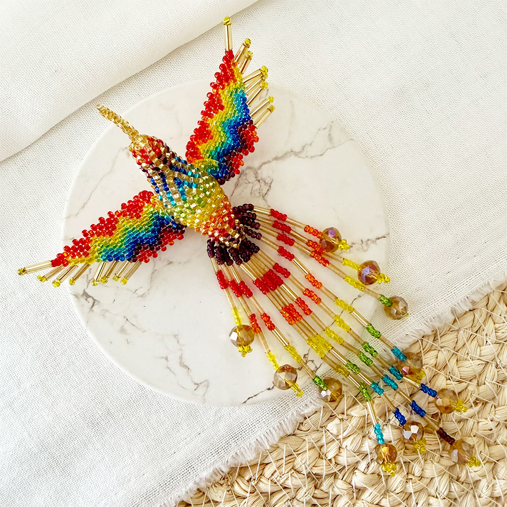 Pin prendedor en forma de Colibrí, tejido en chaquiras mini checas en diferentes tonos por manos artesanas de nuestra cultura embera del departamento del Putumayo.