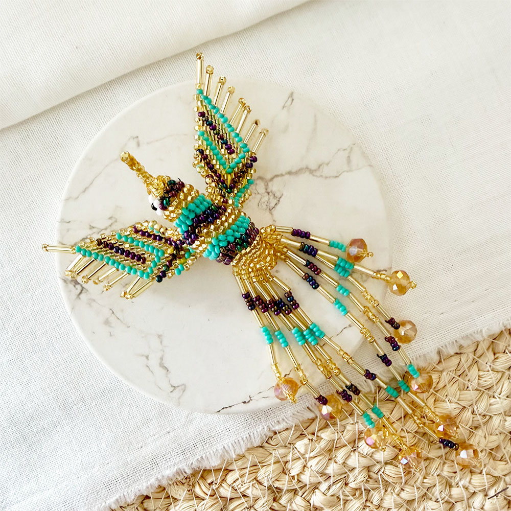 Pin prendedor en forma de Colibrí, tejido en chaquiras mini checas en diferentes tonos por manos artesanas de nuestra cultura embera del departamento del Putumayo.