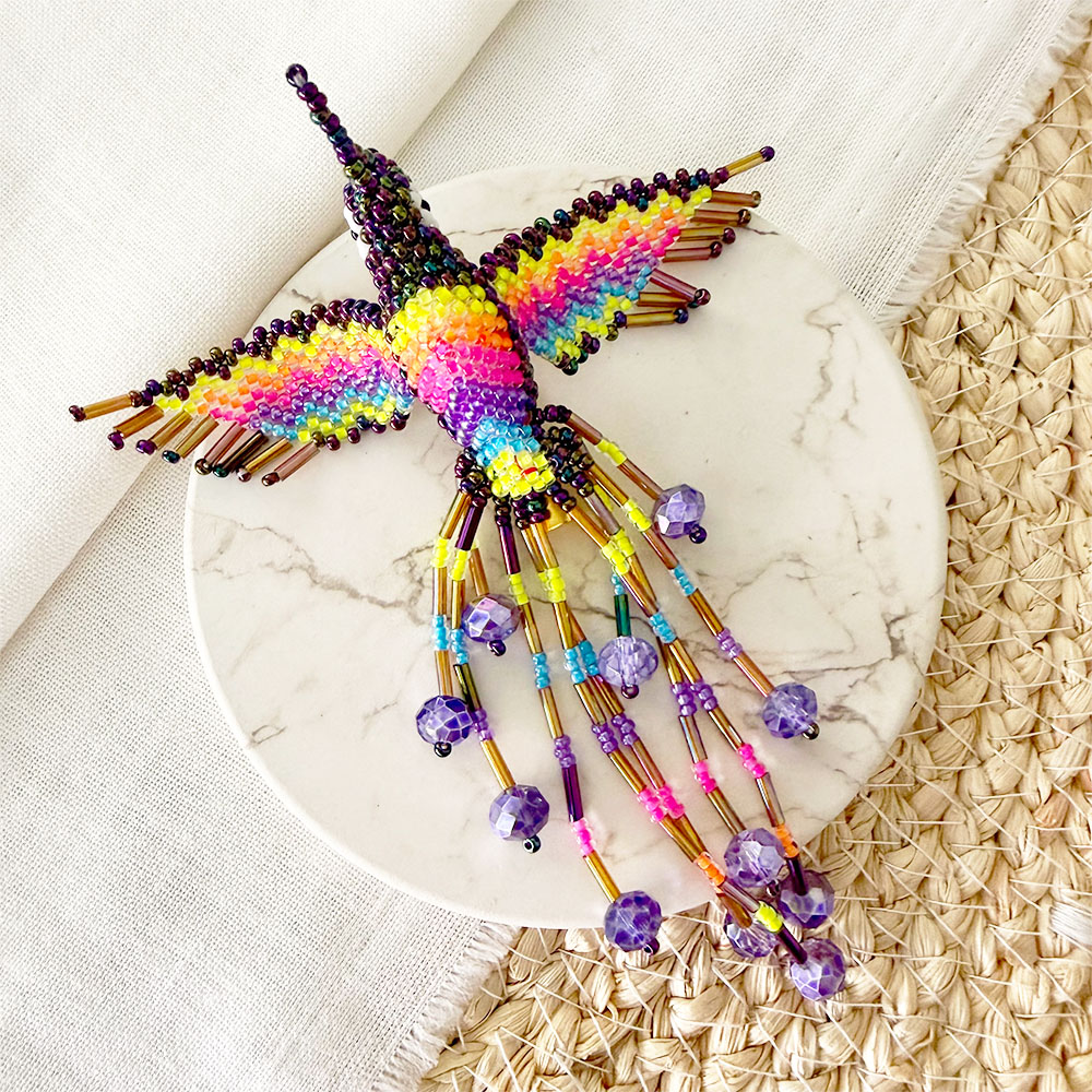 Pin prendedor en forma de Colibrí, tejido en chaquiras mini checas en diferentes tonos por manos artesanas de nuestra cultura embera del departamento del Putumayo.