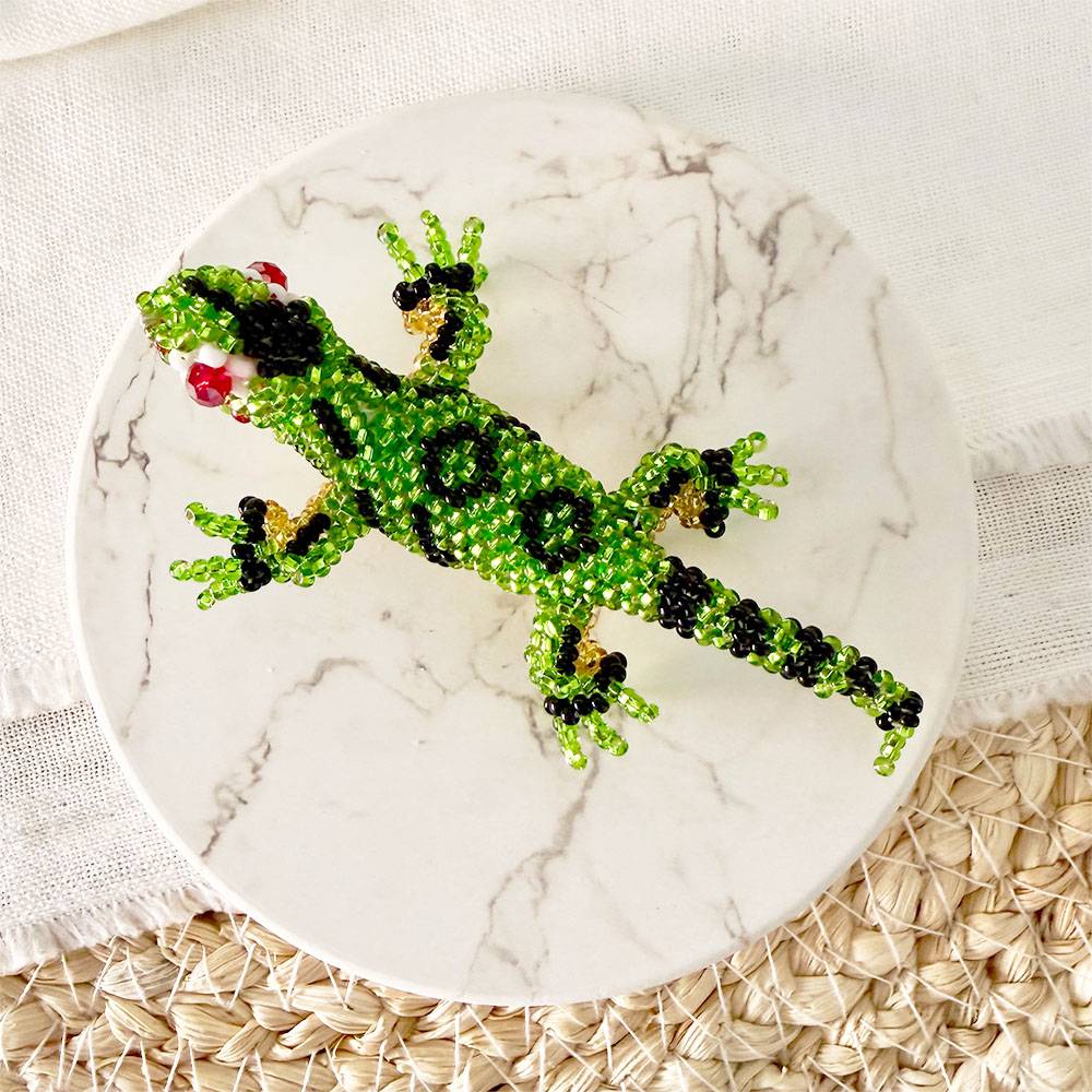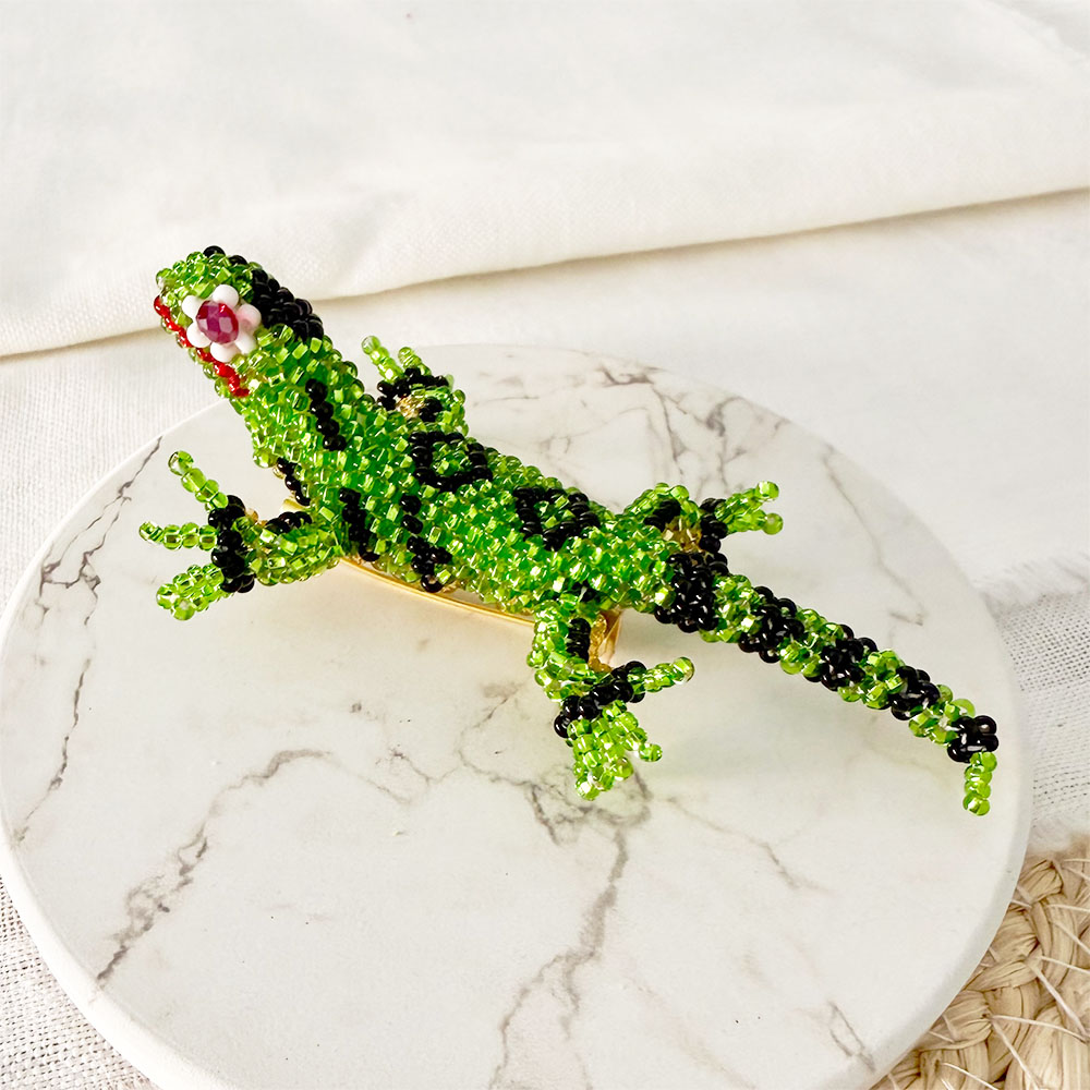 Pin prendedor en forma de iguana, tejido en chaquiras mini checas en diferentes tonos por manos artesanas de nuestra cultura embera del departamento del Putumayo.