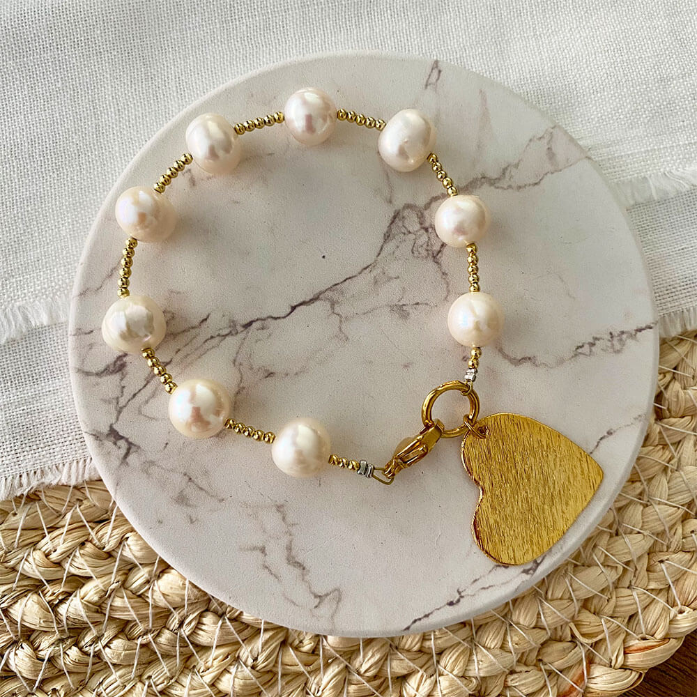 Pulsera en base guaya metálica, perlas naturales cultivadas de 10 mm, balines y corazón en bronce con baño en oro, calado y texturizado a mano, broche y argolla en acero dorado.